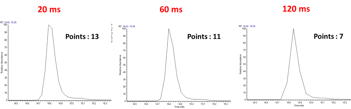 다음은 동일한 target peptide수와 AGC값을 이용하여 서로 다른 MS/MS maximum injection time (MIT) 에 따른 peak point수를 비교해 보았습니다. 특정 이온이 설정한 이온 수 만큼 채워지지 않을 경우 무한정 기다리는것이 아니라 MIT 시간 만큼 최대한 기다린후 다음으로 넘어갑니다. 그래서 펩타이드의 양에 따라 MIT 시간을 다 사용할수도 있고 그렇지 않을수 도 있습니다. 그래서 정확한 비교는 되지 않겠지만 아래와 같이 그림에서와 같이 20 target 펩타이드에서 20, 60, 120 ms 의 MIT를 사용했을때 peak point수는 13, 11, 7로 조금싹 감소하였습니다. 설정한 MIT 값의 차이에 비해서는 point수가 확연히 차이가 나는건 아닌것 같습니다.