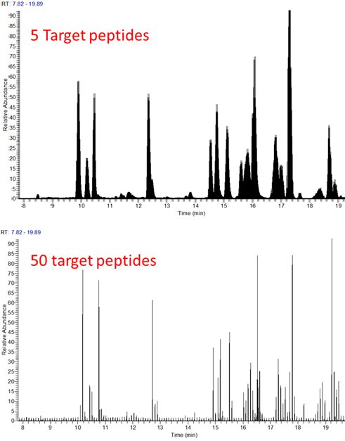 자세하게 보기 위해서 5개와 50개 펩타이드를 분석한 PRM에 대한 크로마토그램을 보겠습니다. 5개 펩타이드를 분석한것이 50개를 분석한것에 비해서 훨씬 촘촘한 피크형태를 보여줍니다.