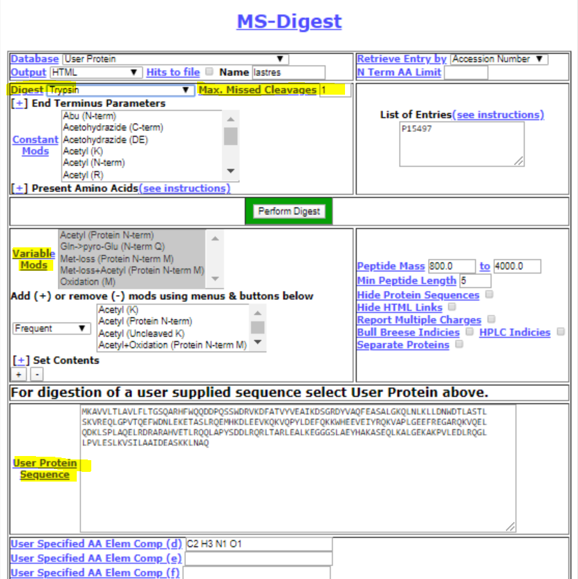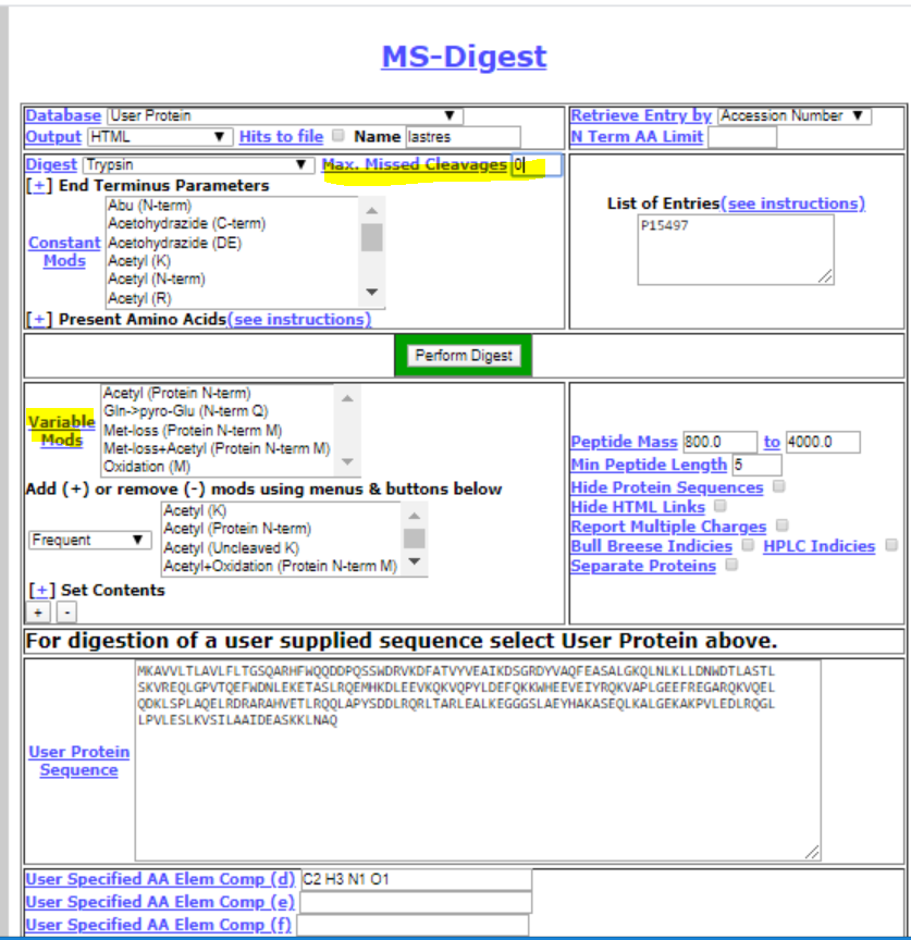 아래화면은 default 화면이다. Digest 에서 원하는 enzyme을 선택하고 Variable Modes 는 모두 unchecked로 바꾼후(회색이 모두 없어지도록) Max.Missed Cleavages로 1에서 0으로 바꾼다. 만약 default값으로 하게 되면 가능한 모든 펩타이드가 보여주게 되어 체크가 쉽지 않다. 그리고 하단의 User Protein Sequence에 본인의 단백질 sequence를 붙혀넣기한다.(Sequence 사이에 스페이스가 없어야 된다). 다른값들은 수정하지 않아도 된다. 준비되면 Perform Digest 클릭