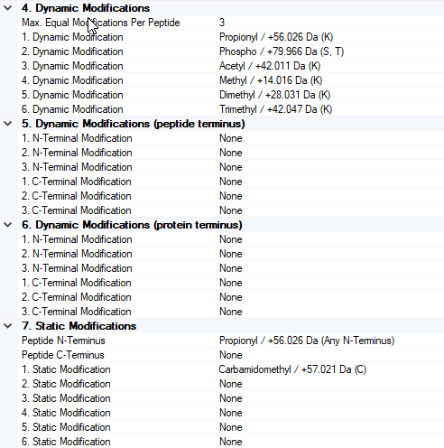 DDA로 분석한 raw 파일을 Proteome Discoverer 2.4로 검색을 해보았습니다. 검색조건은 아래와 같습니다. Lysine에 Acetylation과 mono, di-,tri-methylation, propionylation, Serine, threonine 에 phosphorylation, N-terminal 에 Propionylation을 적용하였습니다.