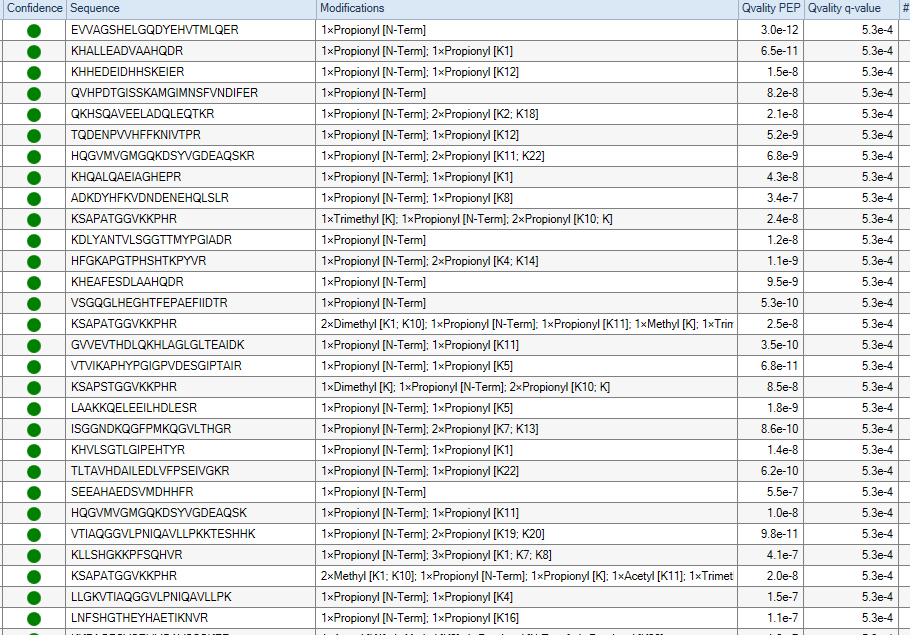 검출된 펩타이드의 경우 모든 펩타이드들이 Propionylation되어 있음을 알수 있습니다.