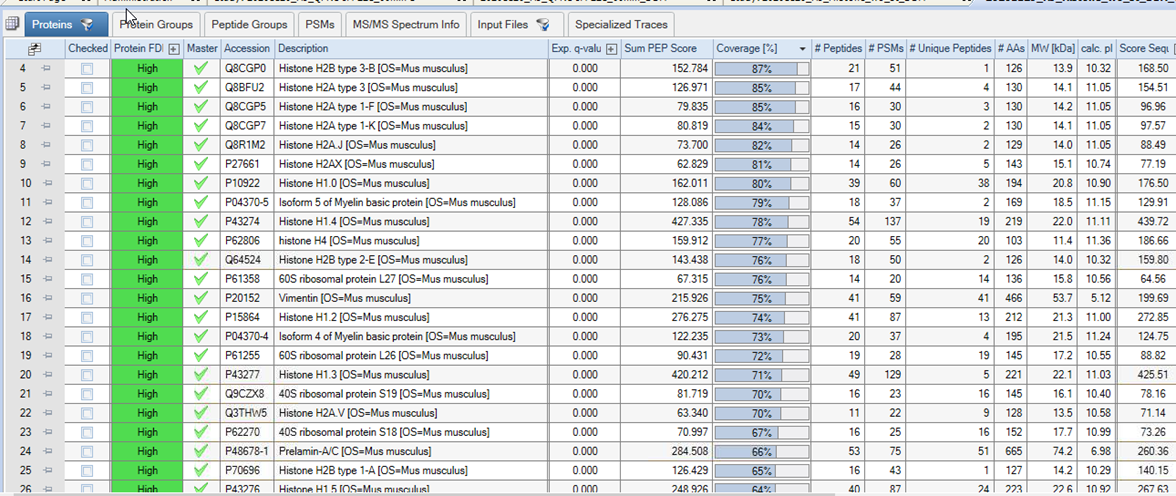 검색결과는 아래와 같은 많은 histone이 높은 sequence coverage로 검출되었습니다.