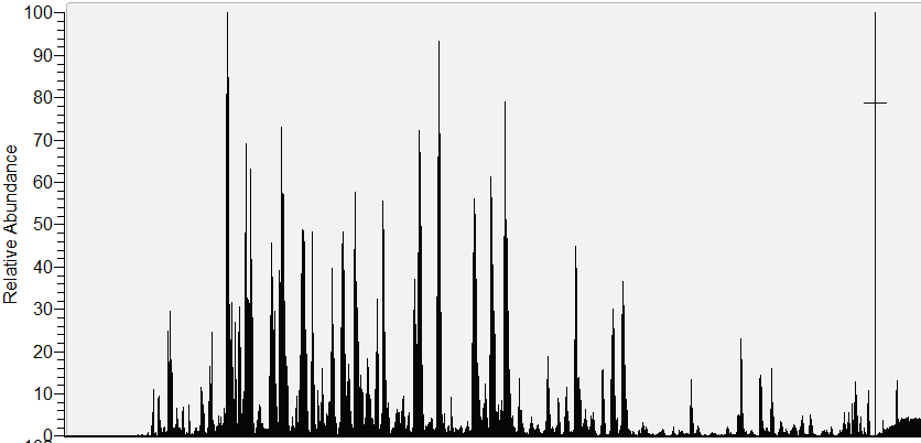 아래 Mouse에서 추출한 Histone을 Propionylation 시킨후 얻어진 스펙트럼입니다. 여느 다른 단백질의 스펙트럼과 특별히 차이는 없습니다.