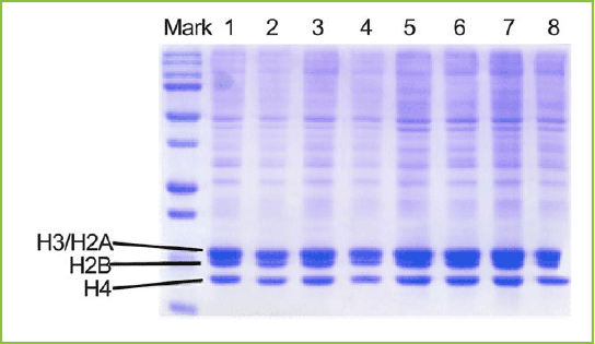 Histone이 아주 잘 분리되었는지 확인하기 위해서 소량을 SDS-PAGE로 확인합니다. 아래 이미지는 대표적인 Histone 에 대한 이미지입니다.