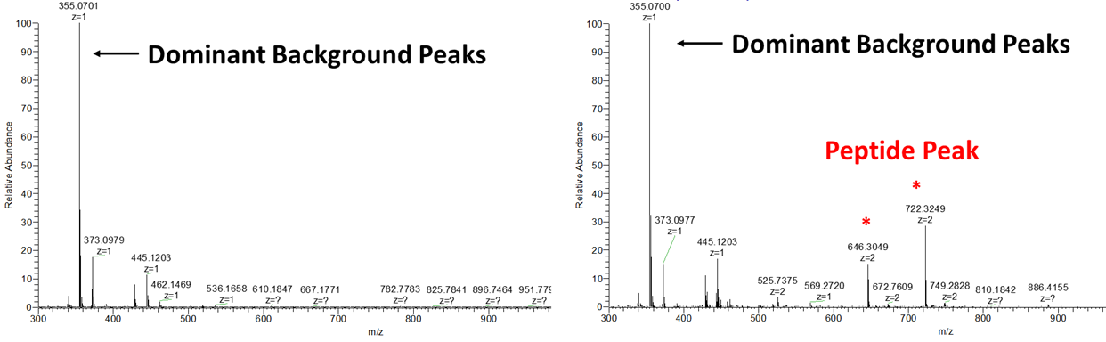 Raw spectra를 자세히 보면 m/z 355.0701 피크가 background 에서 지속적으로 검출되는것을 확인하였습니다. 오른쪽 스펙트럼에서 보듯이 BSA 펩타이드가 존재하지만 이 m/z 355 피크의 높이가 훨씬 높습니다.