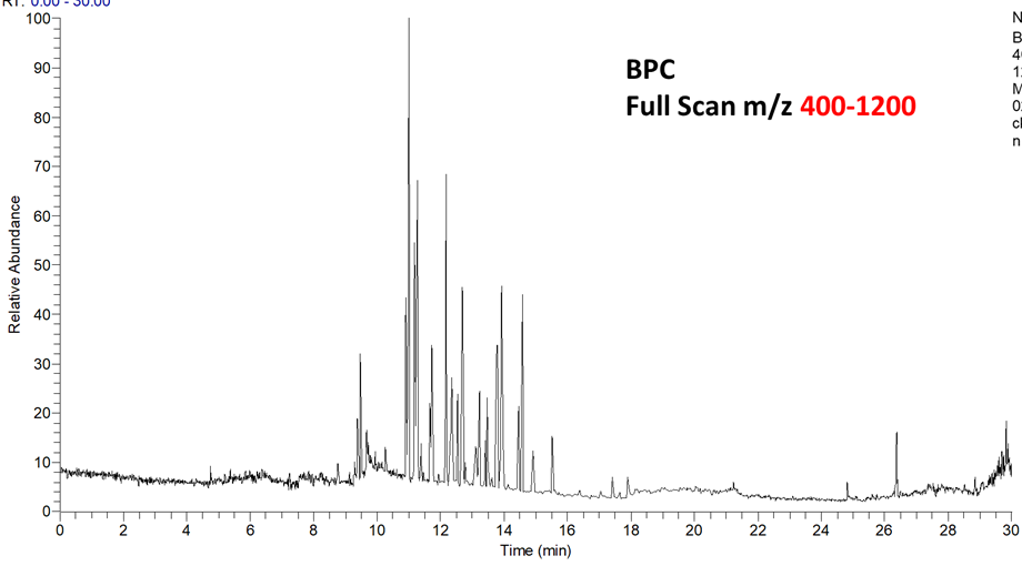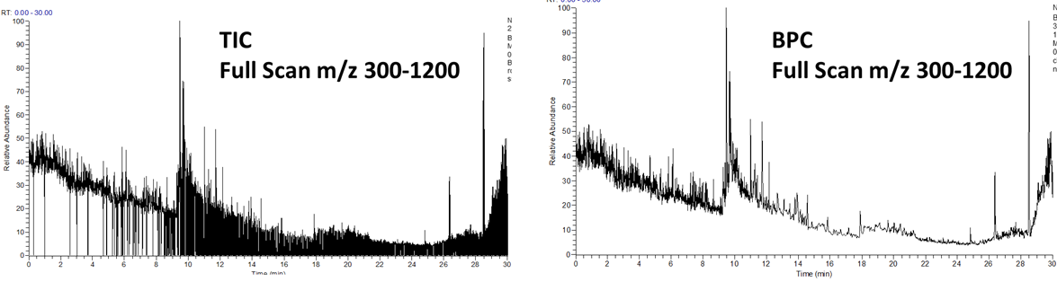 이로인해 모든 영역에서 가장 높이가 높은 m/z 355에 의해 TIC와 BPC 가 정상적으로 보이지 않습니다. m/z 355 피크가 인위적으로 제거된 크로마토그램을 만들기 위해서 Qualbrowser에서 range를 mz 400-1200으로 변경해보겠습니다. 아래와 같이 BPC 에서 기존에 보이지 않았던 BSA 피크들이 보여집니다.