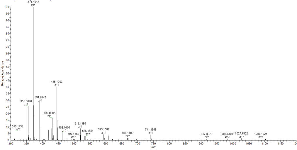 아래 스펙트럼은 일반적으로 볼수 있는 background peak 들입니다. Polysiloxane에 해당하는 371.1012 와 445.1203 피크들이 보입니다. 이러한 피크들은 시료들의 피크에 비해서 상대적으로 높이가 낮기 때문에 큰 문제가 되지 않습니다.
