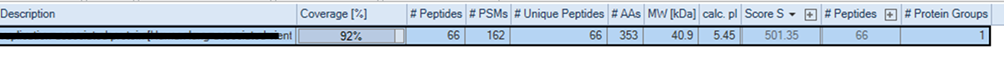 먼저 해당 단백질 fasta 파일만으로 검색하여 총 66개의 unique 펩타이드가 검출되어 92% sequence coverage를 얻었습니다.
