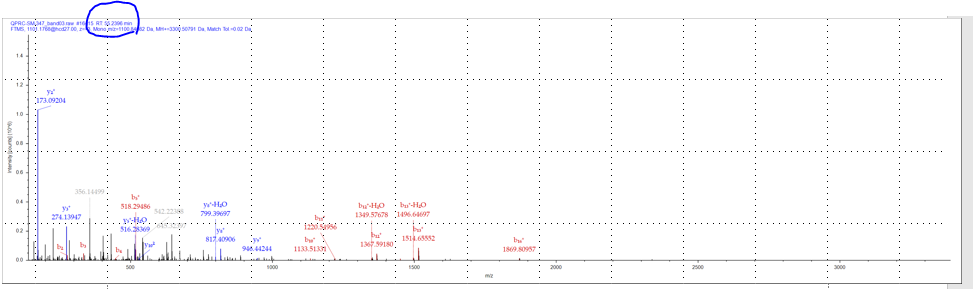 동일한 raw 파일임에도 fasta 파일의 크기에 따라 다른 결과를 보입니다. human fasta 파일로 검색하였을때 검출되지 않았지만 해당 단백질 fasta파일에서 검출된 펩타이드의 MS/MS 스펙트럼을 확인해보았습니다.