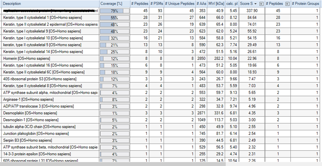 동일한 raw 파일을 Human fasta 파일로 검색을 하였습니다. 아래 보는것과 같이 해당 단백질외에 다른 단백질, 특히 Keratin 단백질이 많이 검출되었습니다. 해당 단백질은 45개의 unique 펩타이드가 검출되어 79% sequence coverage를 얻었습니다.