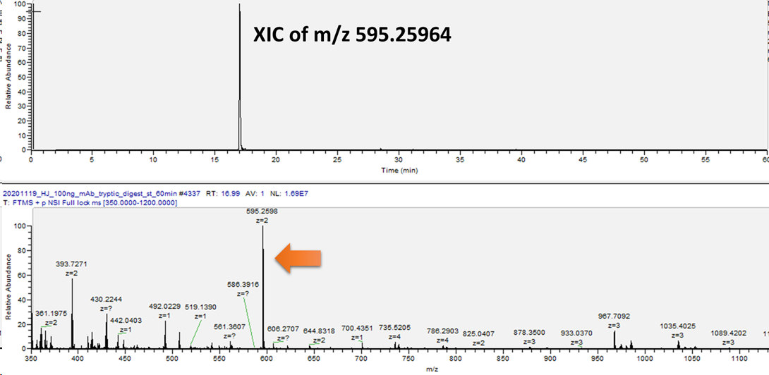 이를 위해서는 PNGase-F를 처리하여 펩타이드 backbone의 용리시간을 알아야합니다. 하지만 다행히 이미 정보를 알고있으며 더 나아가 해당펩타이드 EEQYNSTYR (m/z 595.2596)가 검출되었습니다.