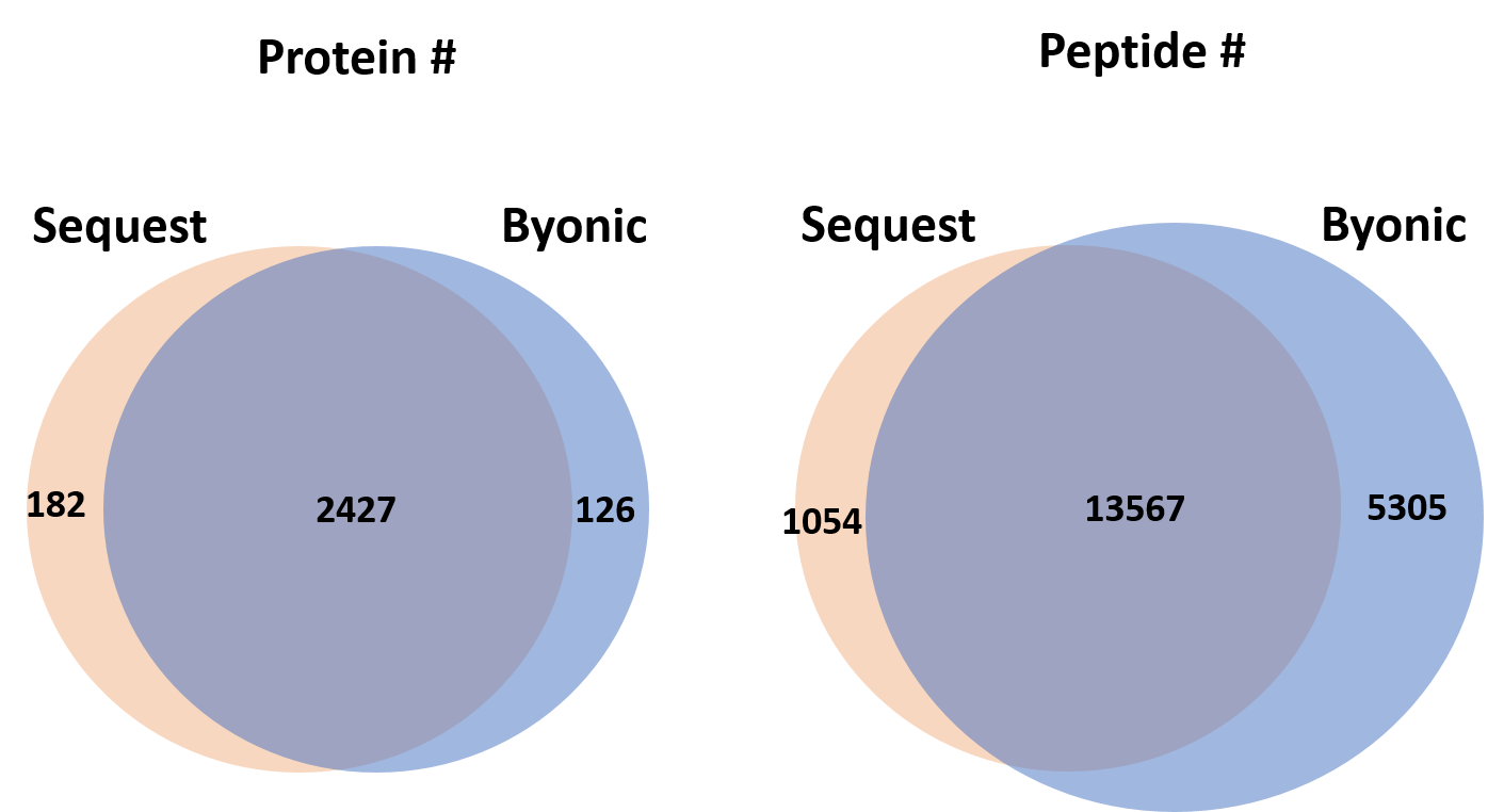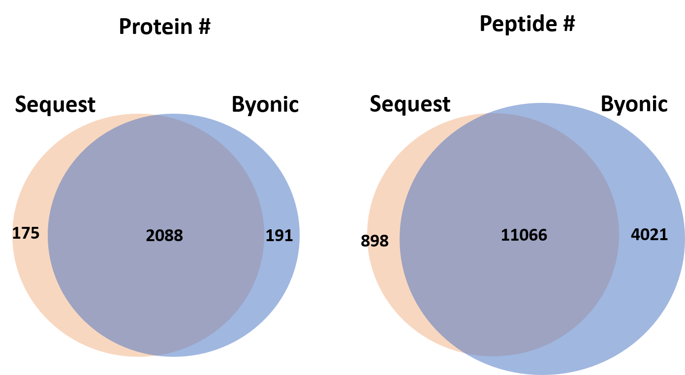 놀랍게도 Byonic에서 추가적인 펩타이드가 많이 검출되었다. (단백질수에는 큰 영향이 없었다).
