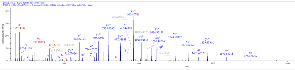 물론 Byonic에서 새롭게 검출된 펩타이드가 모두 True-positive는 아닐것이다. 하지만 아래 Spectrum에서 보듯이 Sequest HT 에서는 검출되지 않았지만 Byonic에서 아주 좋은 Quality로 검출이 되었다.