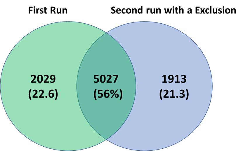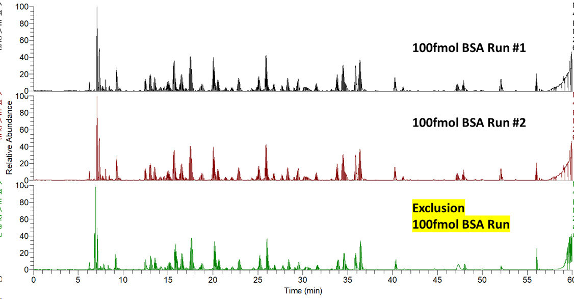.시료를 분석할때 용리되는 모든 펩타이드를 질량분석기가 분석하는것은 불가능합니다. 예를 들면 Data-dependent Acquisition (DDA)은 주어진 시간에서 용리된 펩타이드의 Full scan에서 높이가 가장 높은 펩타이드 순으로 검출합니다. 그러므로 상대적으로 펩타이드의 높이가 낮은 경우 MS/MS가 수행되지 않고 넘어갈때가 있습니다. 동일한 시료를 여러번 분석을 하더라도 검출이 되지 않는 펩타이드는 여전히 분석이 안될 가능성이 많습니다. 이때유용하게 사용할수 있는것이 peak exclusion mode 입니다.