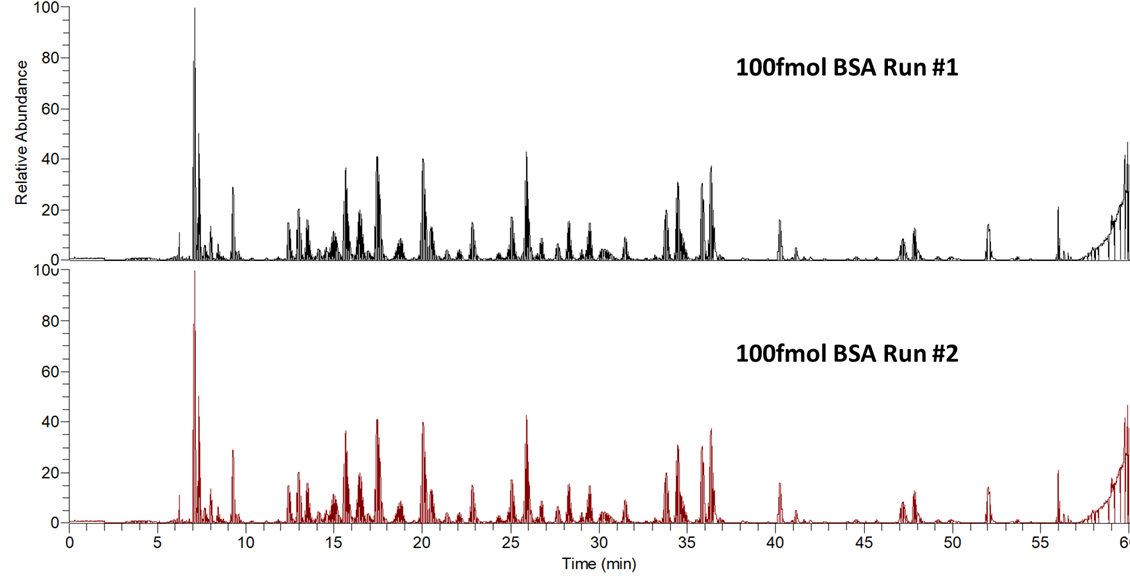아래 크로마토그램은 100fmol BSA를 60min gradient 로 두번 분석한것입니다. LC retention time에 재현성이 있음을 확인하였습니다.