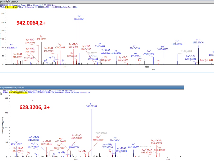 Exclusion에서 검출된 한개의 펩타이드인 EVQLVESGGGLVQPGGSLR를 비교해 보겠습니다. 첫번째에서는 2+인 942.0064가 검출되었습니다. 두번째 exclusion 을 통해 분석한것은 3+인 628.3206이 검출되었습니다. 동일한 펩타이드이지만 m/z값이 다르기 때문에 두번째 분석에서 새롭게 검출이 되었습니다. Exclusion list는 펩타이드 sequence 가 안인 오직 m/z 와 retention time만 인식합니다.