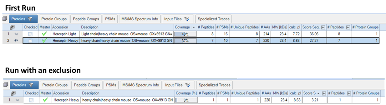 Reduction과 akyation을 하지 않은 Herceptin mAb tryptic digest에 대한 결과는 아래와 같습니다. exclusion list를 포함시킨 결과에는 오직 한개의 펩타이드만이 검출되었습니다.