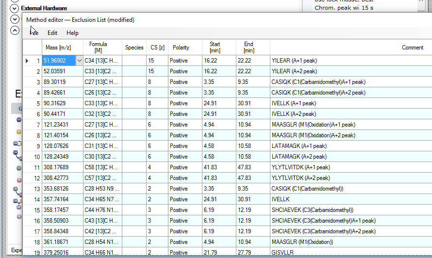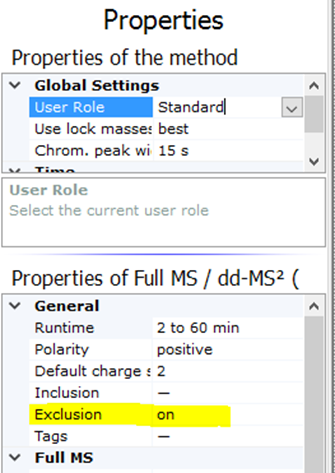 창을 닫으후 질량분석기의 Properties에서 Exclusin On을 선택합니다. 이렇게 되면 질량분석기는 Exclusion에 있는 펩타이드 리스트를 분석과정에서 제외시킵니다. Exclusion On을 하지 않으면 비록 리스트가 존재하더라도 실제분석에서 exlusion을 수행하지 않습니다.
