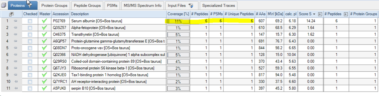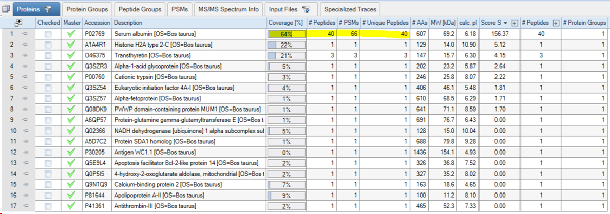 해당 raw 파일을 검색한 결과는 아래와 같습니다. 40개의 BSA 펩타이드가 검출되었 64% sequence coverage를 가집니다.