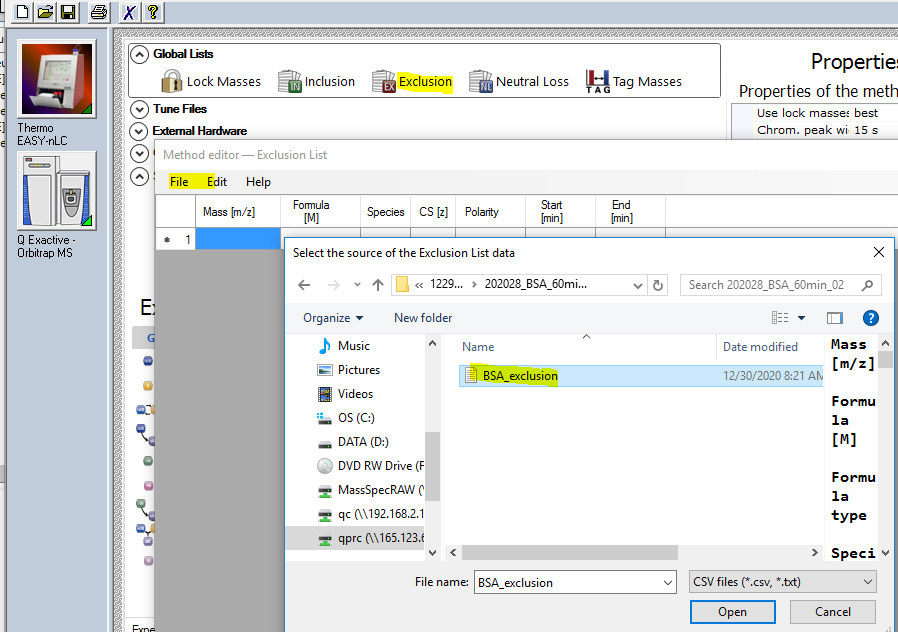 얻어진 CSV 파일을 기준 Method에 첨가하여 새로운 Method를 만듭니다. 이를 위해서 기존 method를 불러옵니다. 아래와 같이 Exclusion-File에서 해당 CSV파일을 불러옵니다.