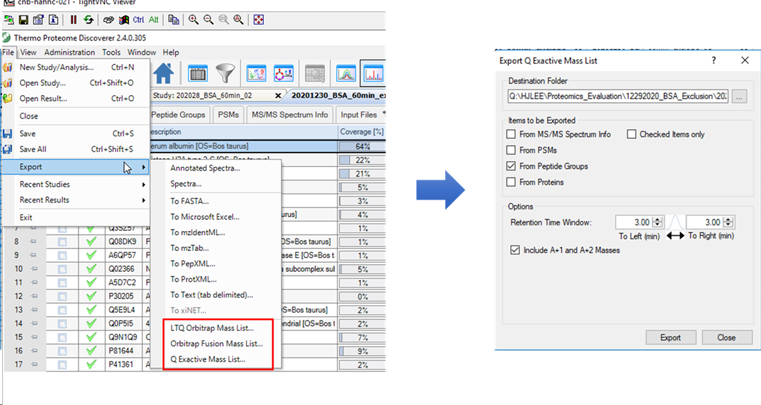 검출된 모든 펩타이드로 exclusion list 를 만들기 위해서 File-Export-Q-Exactive Mass List (Q-Exactive 시리즈 사용시) 를 클릭하여 파일을 생성시킵니다. 이때 검출된 모든 펩타이드를 선택하기 위해서 From Peptide Groups을 선택합니다.
