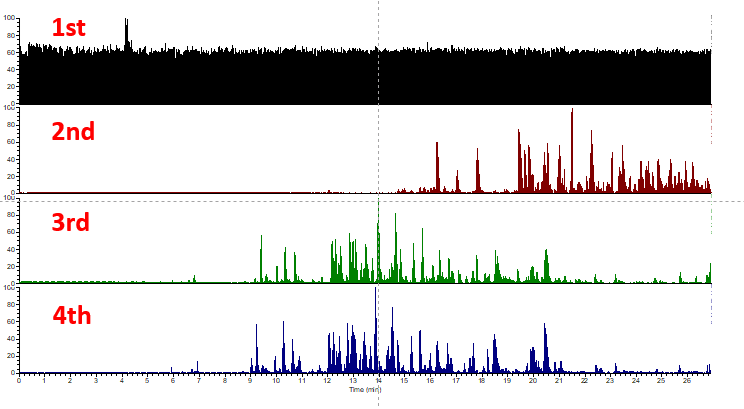 첫번째는 예상대로 아무것도 나오지 않았습니다. 2번째에는 펩타이드가 나왔으며 오른쪽으로 많이 밀려있습니다. 새로 충전된 컬럼은 완벽하게 충진이 안되는 경우가 많습니다. UPLC를 통해 고압력으로 용매가 밀어주면 C18 resin이 다시 한번 더 충진이 됩니다. 이러한 이유로 처음에는 retention time에 변화가 생깁니다. 3번째부터는 정상적으로 나왔고 4번째는 3번째와 유사하게 재현성 있게 나왔습니다. 이제 분석을 위해서 컬럼이 준비되었습니다.