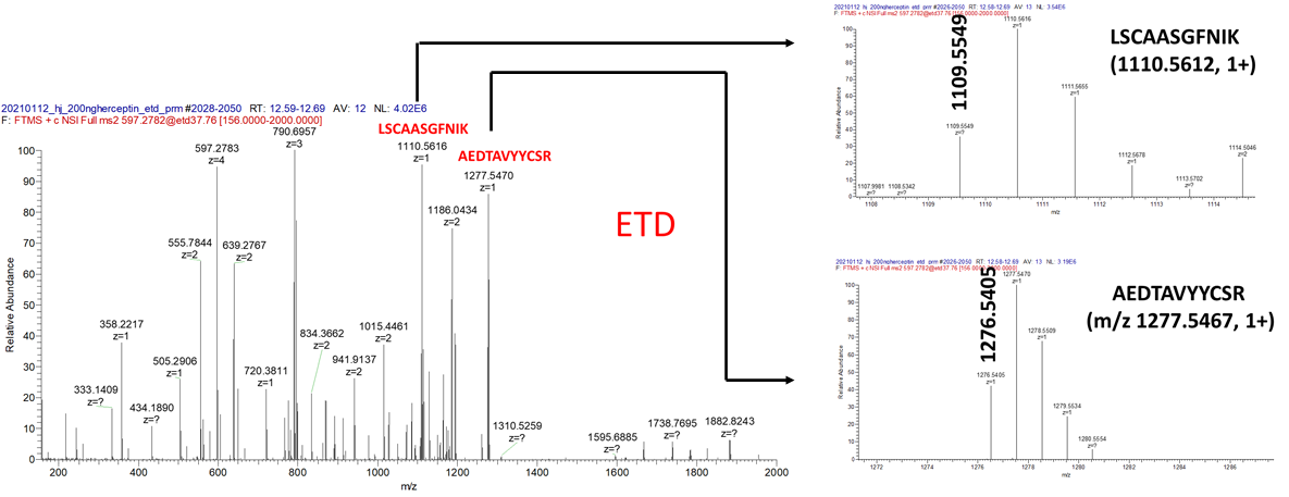 이전의 글에서 Herceptin의 Disulfide-bond 펩타이드를 HCD를 통해 검출할수 있음을 확인하였습니다. 이렇게 검출된 펩타이드는 ETD-PRM-CID MS3 방법으로 추가로 확인이 가능합니다.
