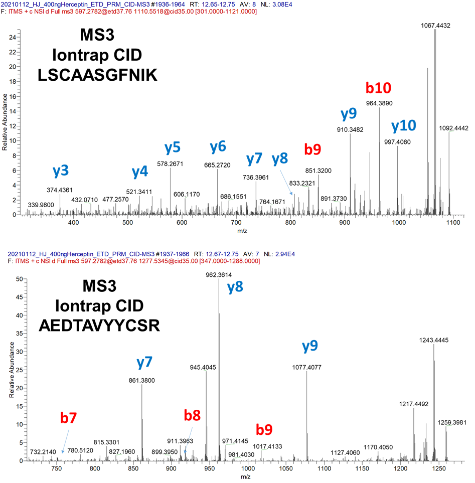 MS2에서 검출되는 두 펩타이드의 Precursor ion들을 한번 더 fragmentation하여 펩타이드 sequence를 추가 검증할 수 있습니다. m/z 597.2782 를 ETD-PRM으로 분석후 MS2에서 검출되는 AEDTAVYYCSR 와 LSCAASGFNIK 의 피크, 1276.5405(1+) 와 1109.5549(1+)를 MS3를 통해 분석하였습니다.