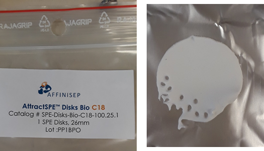 작년에 Affinisep 회사(www.affinisep.com/)에서 테스트용으로 AttractSPE Disk Bio C18 를 받았습니다. Pre-packed C18 tip 은 상대적으로 비싸기 때문에 C18 disk 로 self-pack으로 사용하는것이 비용면에서 훨씬 좋습니다. 기존에는 3M사의 C18 Disk를 사용해 왔습니다. 만약 효율이 나쁘지 않고 가격이 더 저렴하다면 3M 사의 제품을 대체할수 있으리라 생각했습니다. 이를 위해 간단히 Efficiency를 체크해보았습니다. 아래는 샘플로 받은 C18 disk이며 적절한 크기로 절단해서 파이펫 팁에 충진해서 사용하면 됩니다.