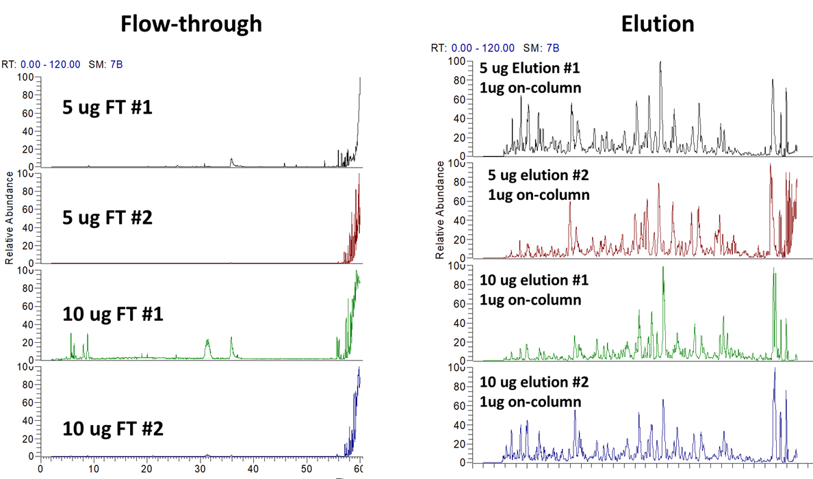 아래는 각각의 분석에서 얻어진 크로마토그램입니다. Flow-through fraction 에서는 거의 펩타이드가 검출이 되지 않았으며 Elution에서는 재현성 있게 펩타이드가 검출되었습니다.