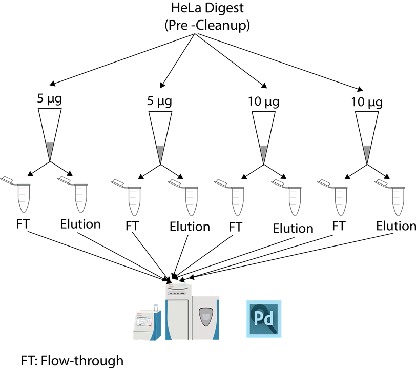 이를 위해서 5 µg 과 10 µg 을 각각 두번씩 컬럼에 적용한후 Loading/washing fraction (Flow-through, FT)와 Elution fraction을 각각 모아서 질량분석기로 측정하였습니다. Flow-through는 모든 양을 다 주입하였고 Elution은 용리된 펩타이드중 각각 1 µg이 주입되도록 하였습니다.