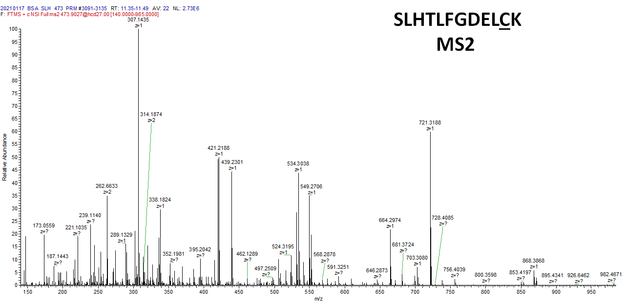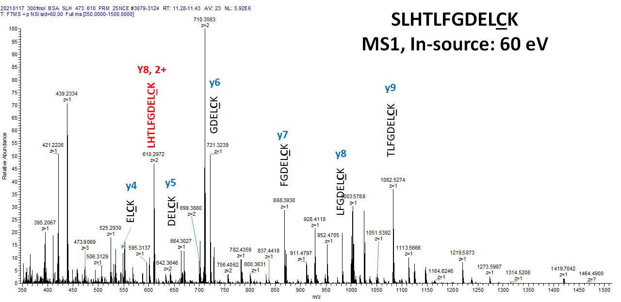아래는 SLHTLFGDELCK 와 동일한 retention time 에서 60 ev in-source fragmentation을 통해 얻어진 MS1 스펙트럼입니다. 아래 보는것과 같이 MS1 스펙트럼임에도 불구하고 SLHTLFGDELCK의 MS2 스펙트럼에서 검출되는 product ion들이 검출되었습니다. 이 스펙트럼은 SLHTLFGDELCK 을 isolation 하여 fragmentation시킨것이 아니기 때문에 동일한 시간에 용리된 모든 펩타이들의 ion-source fragments 들이 모두 포함되어 있습니다.