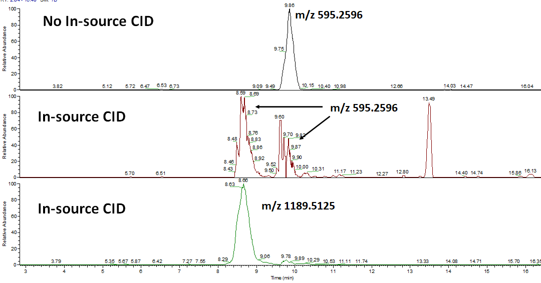 In-source fragmentation을 수행하였을때 약간 더 이른 시간에 EEQYNSTYR 에 해당하는 두 피크인 m/z 595.2596 (2+) 와 m/z 1189.5125 (1+) 가 8.6분에서 검출이 되었습니다. 이것은 원래 N-linked glycopeptide 형태로 있었기 때문에 C18컬럼에서 EEQYNSTYR 과 분리됩니다. 그리고 먼저 컬럼에서 용리된후 In-source fragmentation 으로 인해 N-linked glycan이 떨어지게 됩니다. 여기서 완전히 fragmentation되지 않고 남은 Intact backbone 펩타이드도 검출이 됩니다.