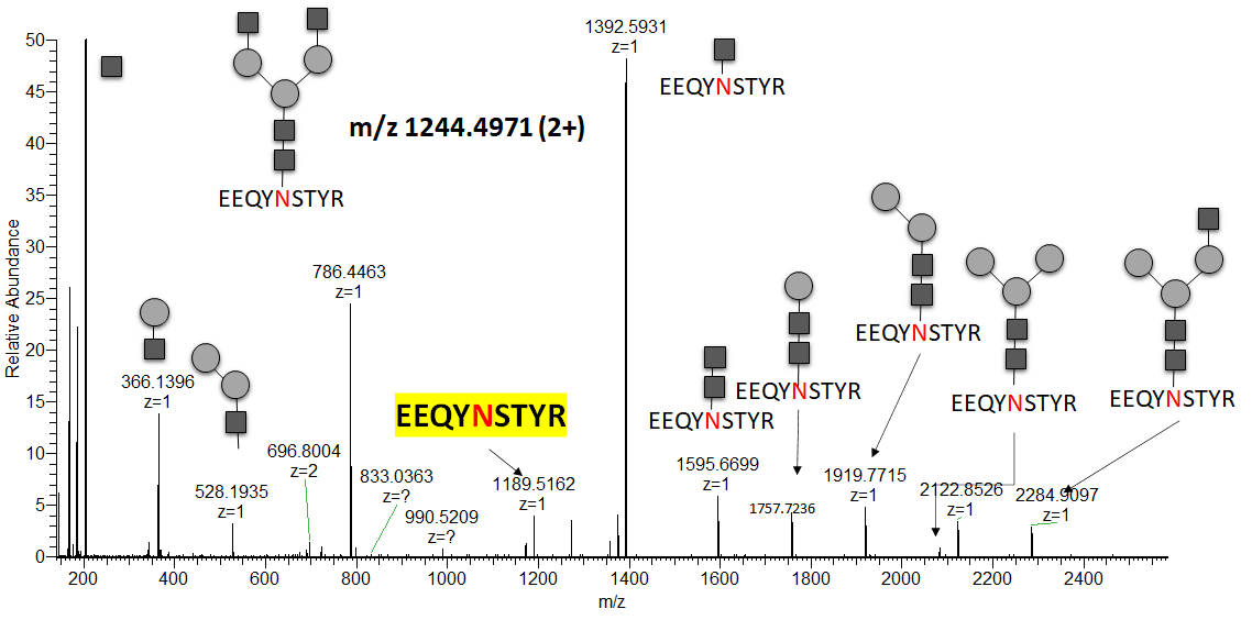이전 글에서 보듯이 EEQYNSTYR backbone에 다양한 glycan이 붙어 있습니다. 그리고 그들의 MS2 스펙트럼에는 backbone에 해당하는 EEQYNSTYR (m/z 1189.5162, 1+) 이 검출됩니다.