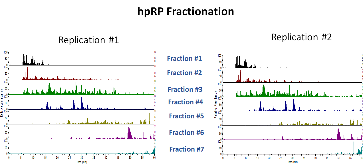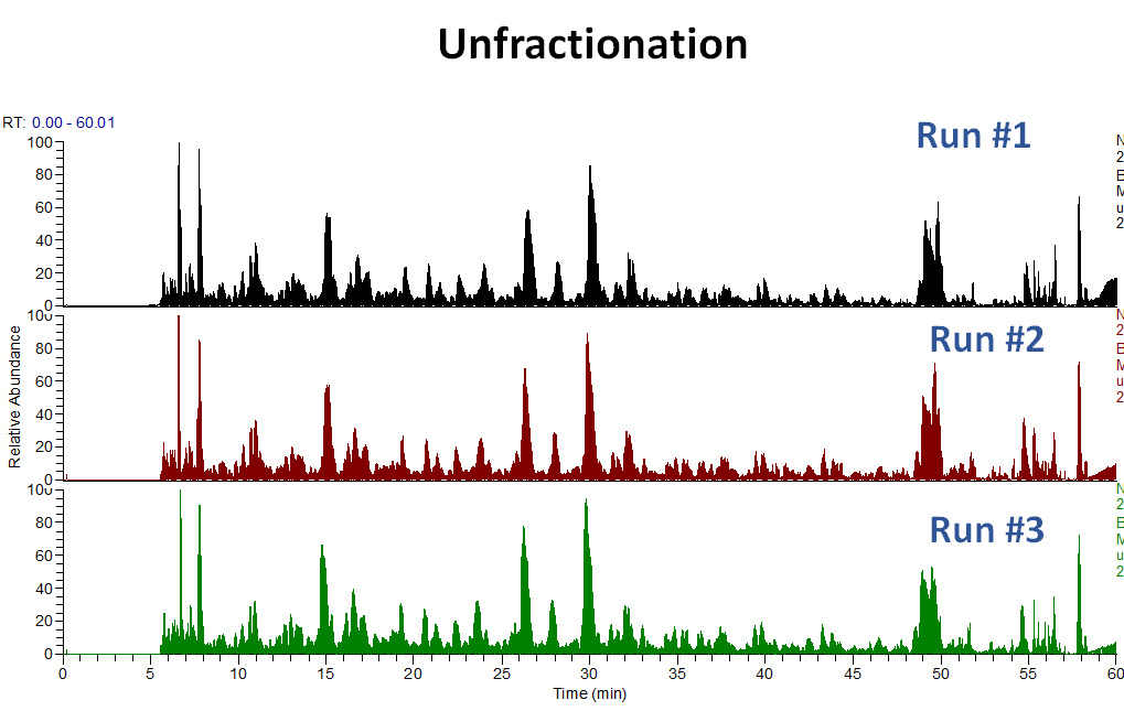 아래는 10 µg 을 두번 분획후 각각 절반 ( 5 µg on-column)을 질량분석기로 분석한 크로마토그램입니다. 두 번의 분획후 분석한 크로마토그램이 거의 동일한 패턴으로 검출되었습니다.