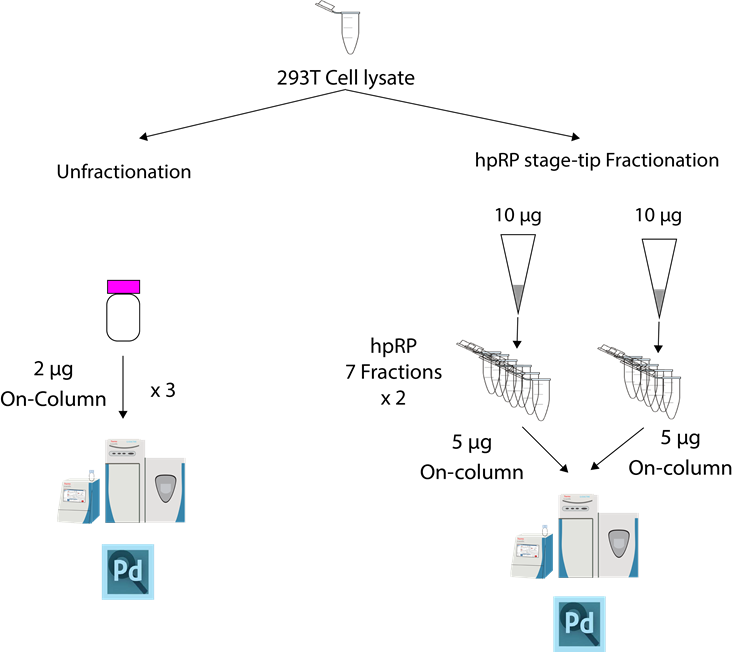아래 그림과 같이 293T cell lysate 펩타이드를 이용하여 7개로 분획하였습니다. 또한 분획하지 않은 결과와 비교하였습니다.