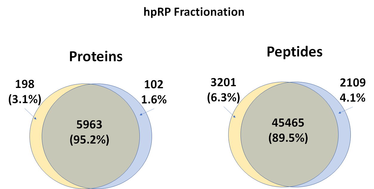 두번의 반복 분획에서 얻어진 단백질과 펩타이드 수에 대한 벤다이어 그램입니다. 단백질의 경우 95 %, 펩타이드의 경우 89.5% 가 겹칩니다.