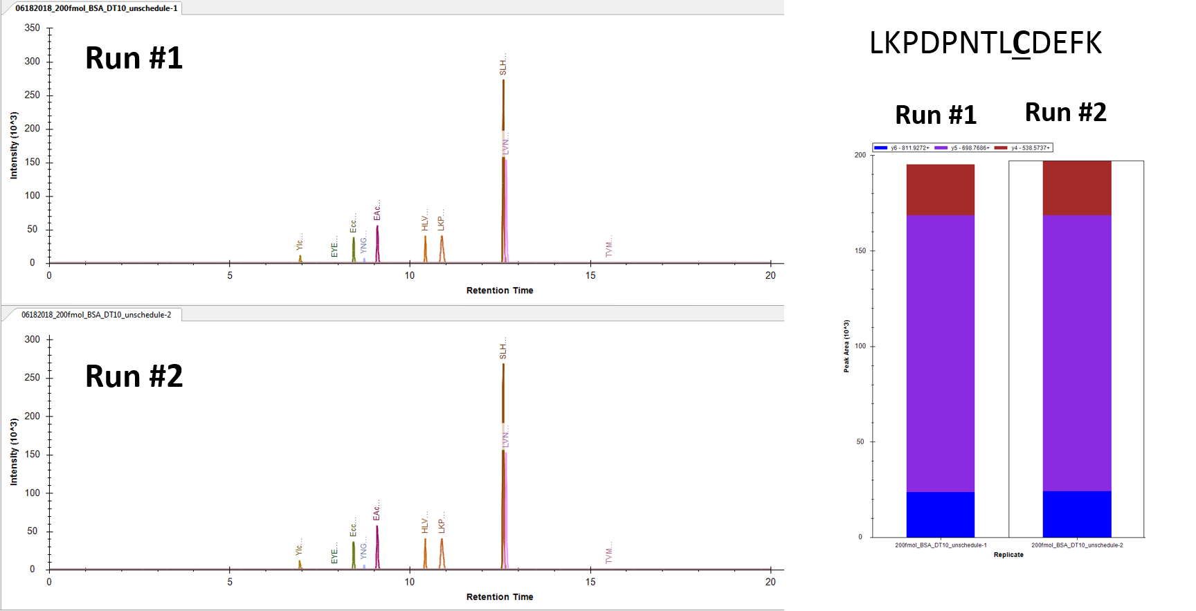 재현성이 높을 수록 Target 단백질의 RT window를 좁게 설정할수있다. 이를 통해 주어진 시간에 최대한 많은 수의 펩타이드를 분석할수있다. 아래는 BSA 펩타이드 (VPTANVSVVDLTCR)의 서로 다른 RT window 값에서 얻어진 정량값이다. 그림에서 볼수 있듯이 RT window 값이 좁아지더라도 감도의 변화에 전혀 변화가 없었다. 이것은 15초 (+, - 7초)이내의 RT 재현성을 가진다는것을 의미한다. NanoLC 시스템에서 구현하기가 어려운점이다.