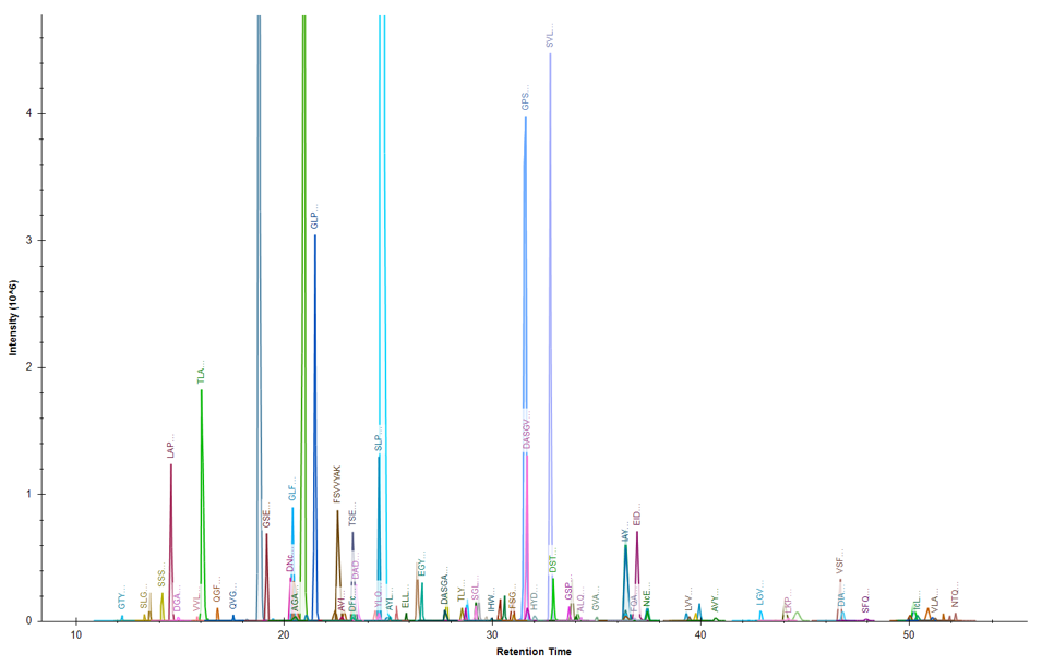 차후 System Suitability 측정을 위해 Standard BSA를 분석하였다. 보통 nano UPLC와 연결된 Orbitrap Fusion 과 QE series에서 100 fmol 을 사용해 왔음으로 Triple Quadrupole에서는 먼저 200fmol을 주입했다. 대표적인 BSA 펩타이드를 선정후 Unscheduled MRM을 사용했다. 아래그림은 200 fmol BSA에 대한 대표적인 10개 펩타이드에 대한 MRM 크로마토그램이다.