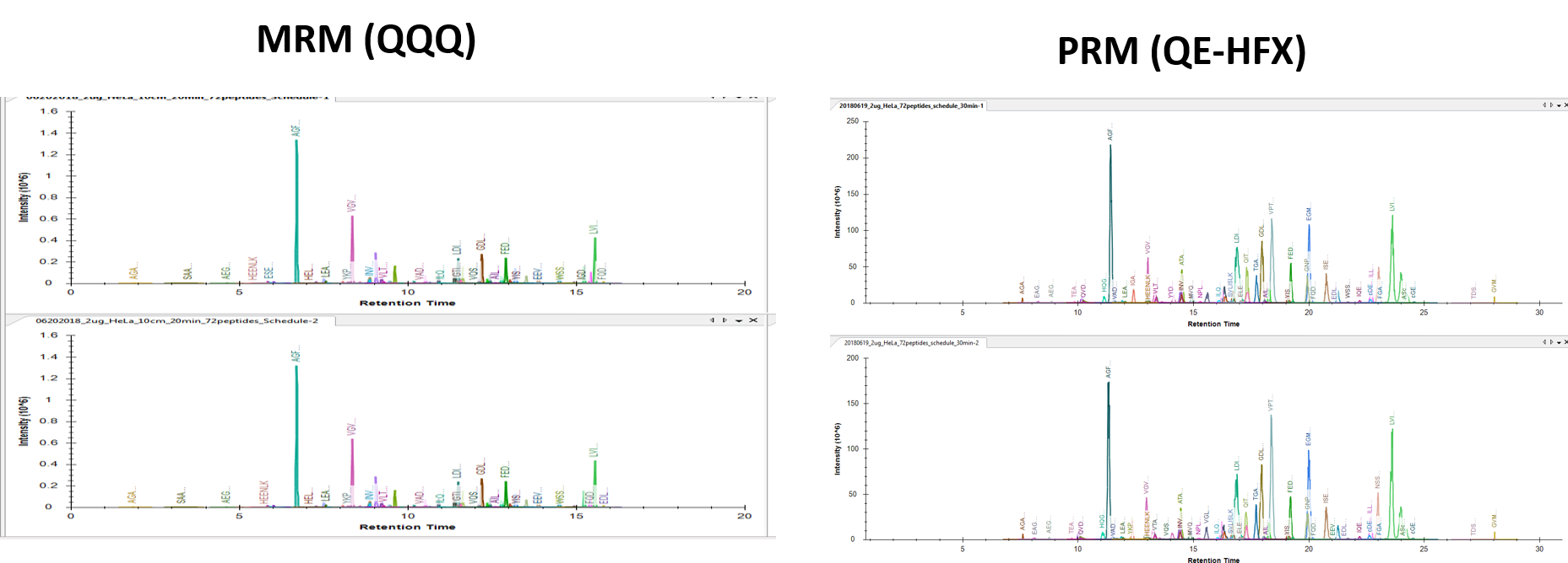 2 µg HeLa에 대해 nano LC system이 연결된 QE-HFX 의 PRM 과 비교를 해보았다. 두개의 분석 방법이 다름으로 절대 비교는 할 수 없지만 MRM의 높은 selectivity와 UPLC system의 높은 resolution로 인해 micro-flow임에도 매우 좋은 결과를 보여줬다