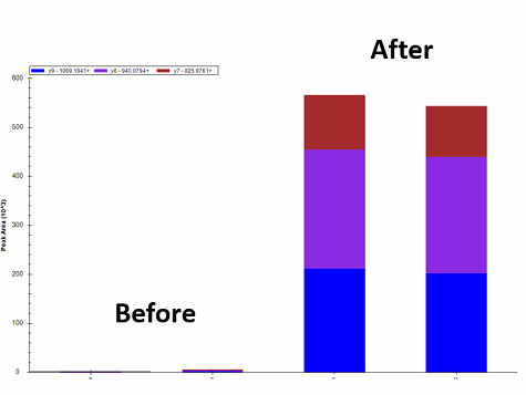 아래 그림은 일정기간 장비를 이후에 장비 크리닝 전후를 보여준다 (100fmol BSA, TVMENFVAFVDK)