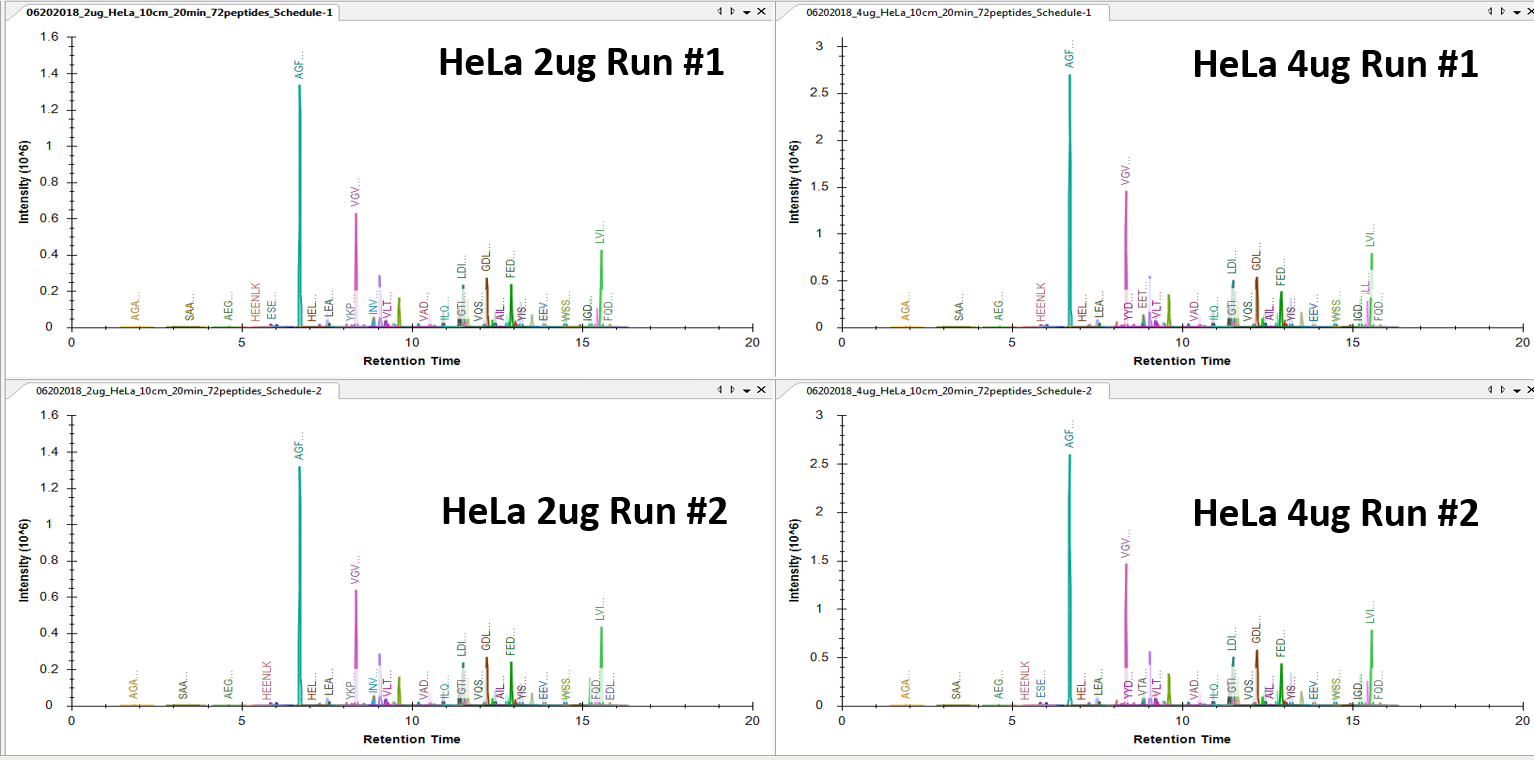다음은 Hela digestion 에서 231 transition에 해당하는 72개 펩타이드의 scheduled MRM 크로마토그램이다. 20 min LC gradient를 이용하여 2 µg 과 4 µg 을 각 두번 분석하였다. 20 min의 짧은 분석 시간임에도 전반적으로 좋은 감도를 보였다.