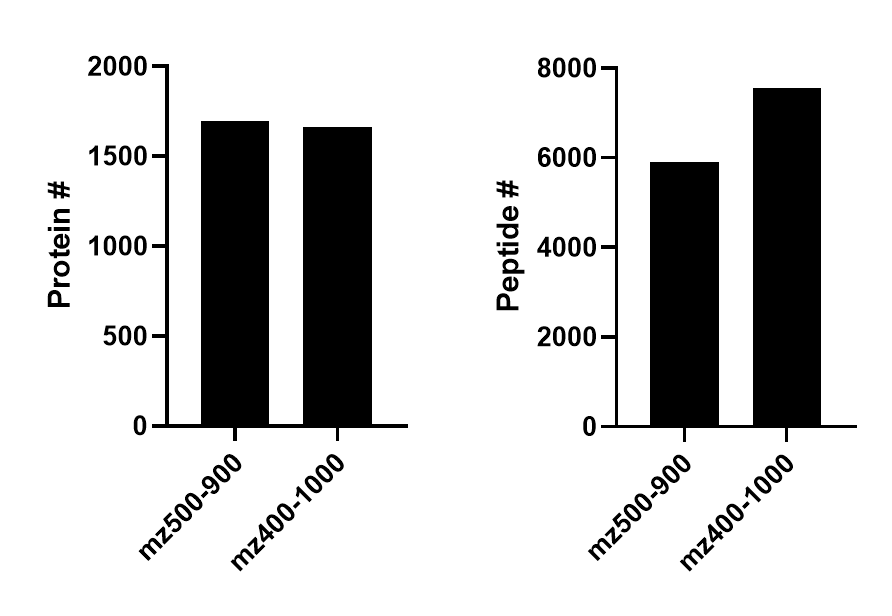아래의 그래프에서 보듯이 검출된 단백질의 숫자에는 큰 차이가 없지만 넓은 구간(m/z 400-1000)에서 더 많은 펩타이드가 검출되었습니다. 더 넓은 구간에서 분석하였으니 더 많은 펩타이드가 검출된것은 당연한 결과입니다. 하지만 검출된 펩타이드가 새롭게 검출된 단백질의 갯수를 증가시키지는 못하였습니다. 아마 다른 charge state 를 가지는 동일한 펩타이드가 검출된것이라 생각합니다.