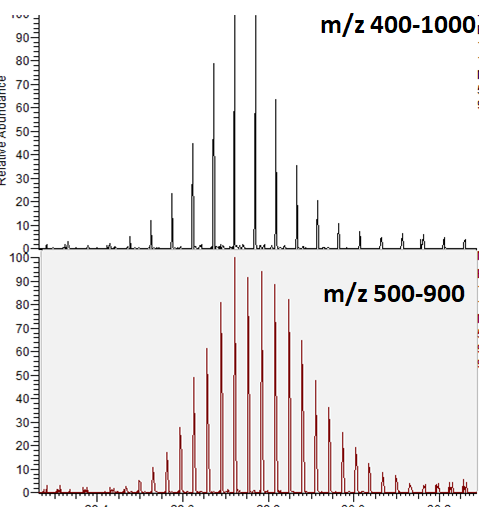 실험실에 QE가 있어서 간단히 m/z 500-900 와 m/z 400-1000 두 구간에서의 결과를 비교해보았습니다.