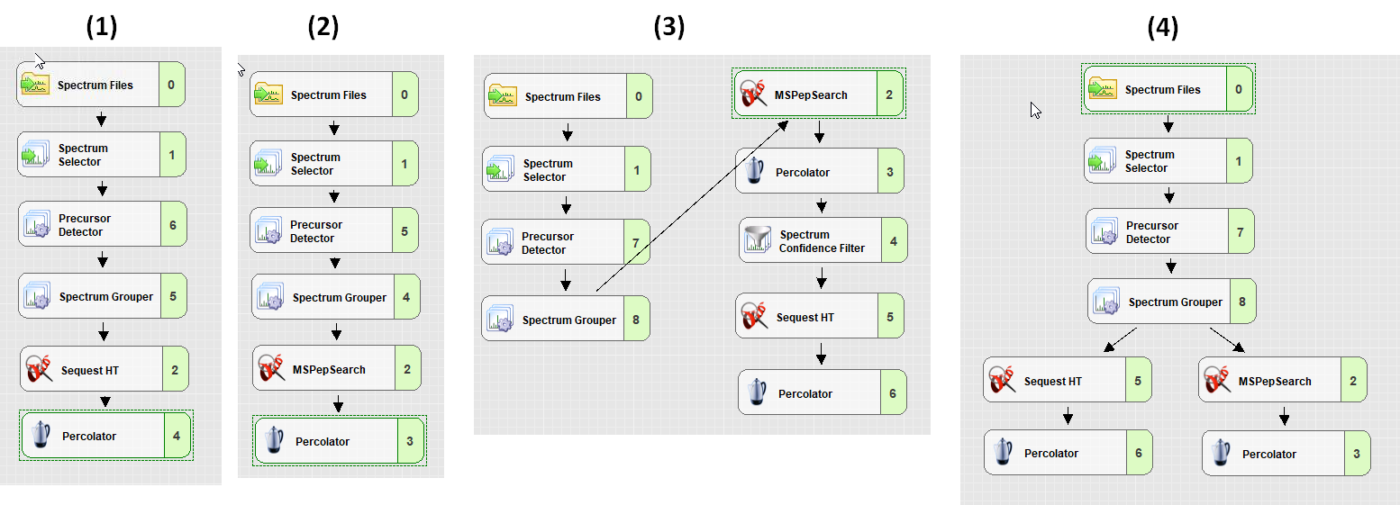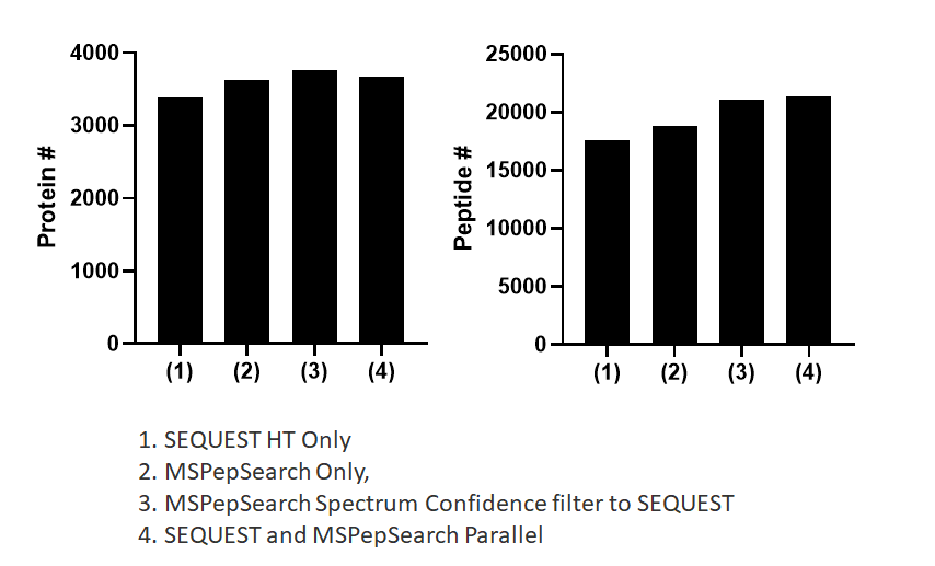 1. SEQUEST HT only, 2. MSPepSearch Only, 3.MSPepSearch Spectrum Confidence filter to SEQUEST, 4. SEQUEST and MSPepSEarch Parallel