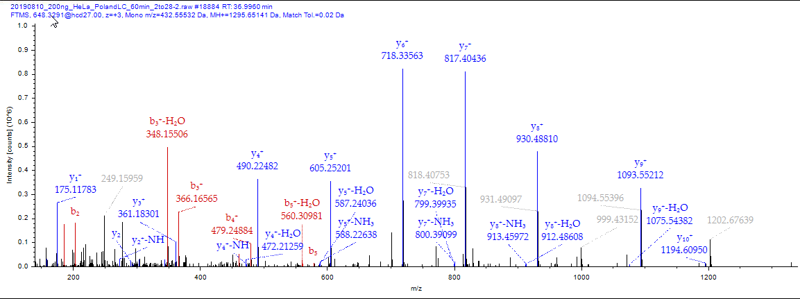 아래 스펙트럼은 MSPepSearch에서 filter가 된후 다시 Sequest에서 High confidence로 검출된 스펙트럼을 보여줍니다.