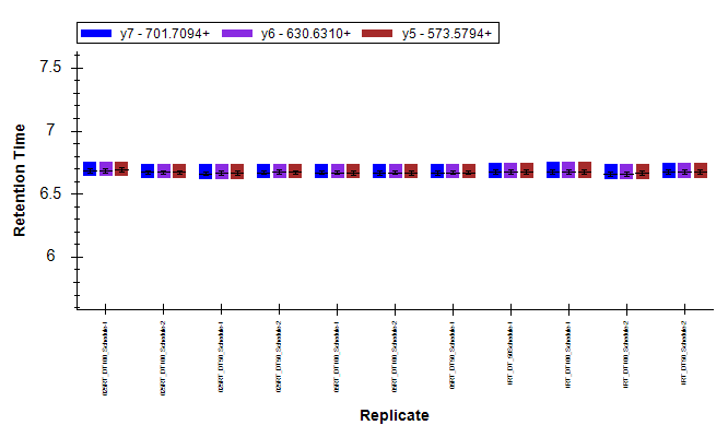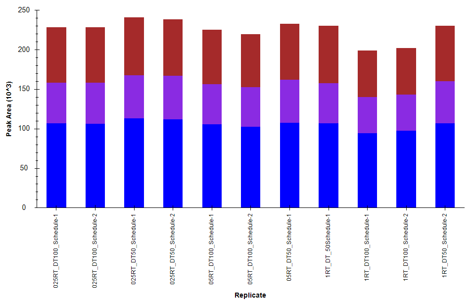 Schedule MRM에서 retention time windows는 1min, 0.5 min (30초), 그리고 0.25min(15초)로 각각 테스트를 했습니다. 또한 Dwell time(DT)의 경우 50과 100으로 각각 테스트 하였습니다. Retention time의 재현성과 상대적인 정량값 그래프를 보여줍니다. 높은 retention time 재현성이 나왔습니다. 또한 정량분석값에도 15초의 좁은 retention time window에도 불구하고 1 min 에서 값과 차이가 거의 없습니다. Nano UPLC에서는 얻기 어려운 재현성입니다. Dwell time의 경우 100 ms 과 50 ms 간의 큰 차이가 없습니다.