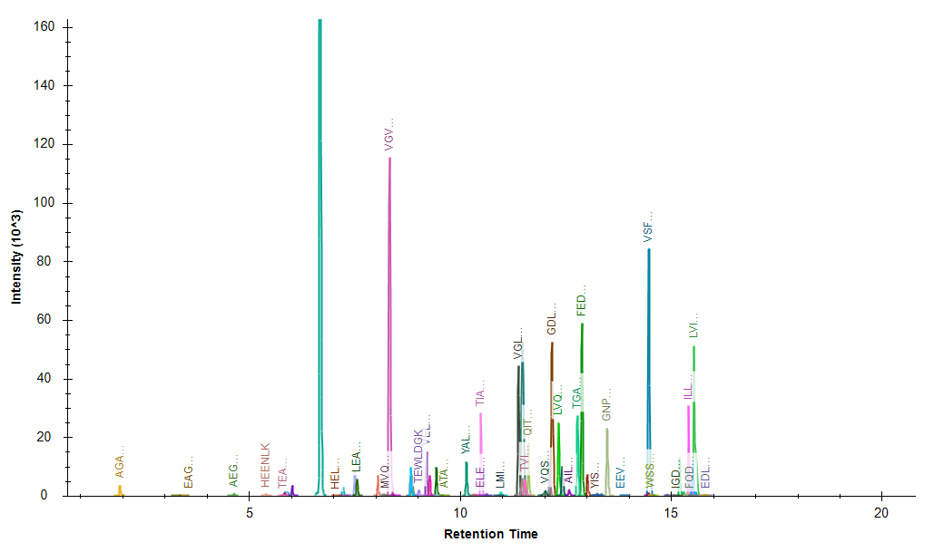 아래는 Skyline 에서 보여지는 Transition chromatogram을 보여줍니다. Skyline 분석결과 115 개 펩타이드에서 72개의 펩타이드가 확실히 검출되 었습니다.