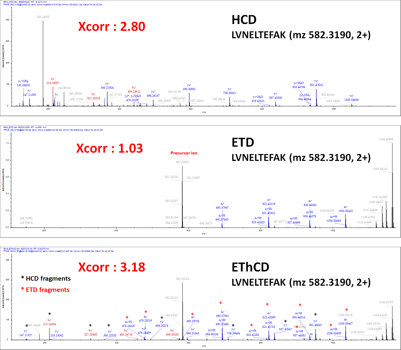 아래는 BSA의 대표적인 펩타이드인 LVNELTEFAK(582.3192.,2+) 의 HCD, ETD, EThcD MS2 스펙트럼입니다. m/z 582.3192 를 PRM 방법을 이용하여 HCD, ETD, EThcD로 각각 분석하였습니다.
