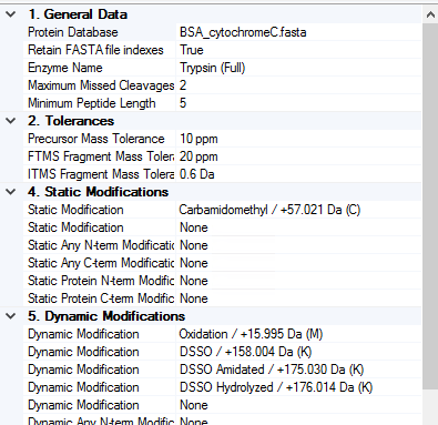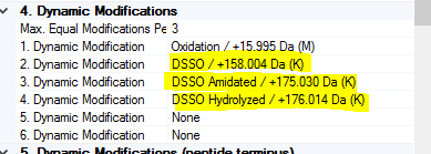Peptides를 설정한 workflow에서는 바로 Sequest로 검색합니다. Dynamic modification에 3가지의 서로 다른 DSSO modification form이 있습니다. 아마 이것은 quenching시 무엇을 사용하느냐에 따라 다르게 설정하는것 같습니다.